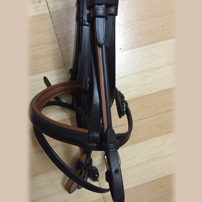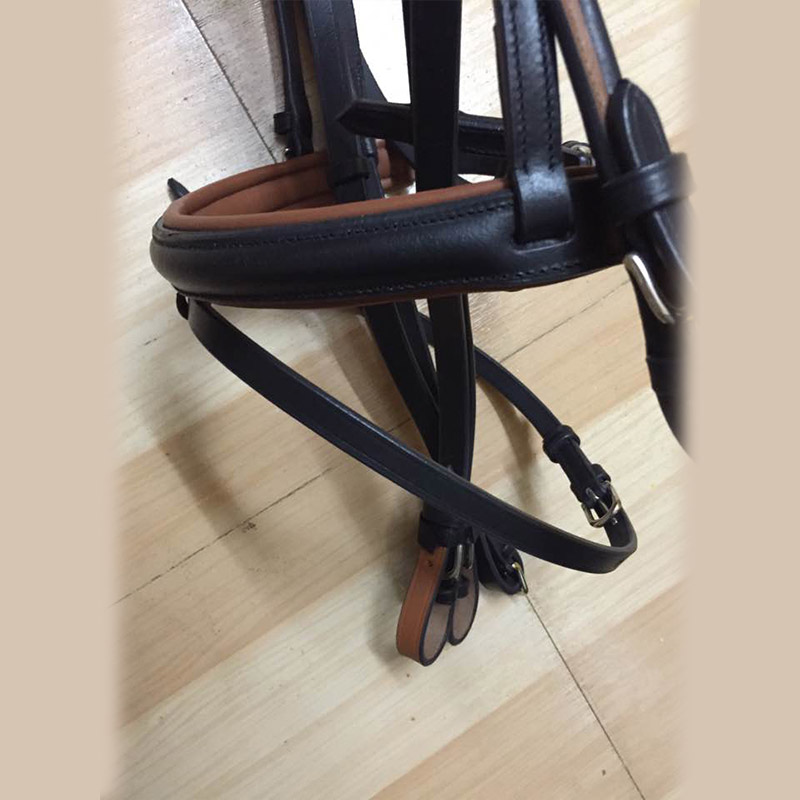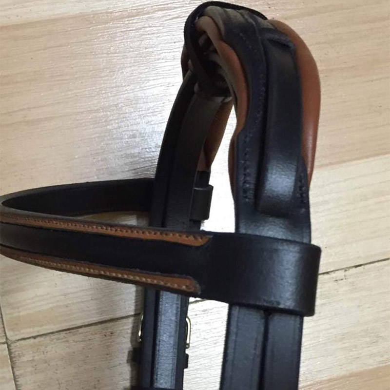 Leather bridle with two tone ambience, special anatomical headpiece with thick padding, raised and padded browband and noseband, plain leather reins with stoppers, ss fittings
